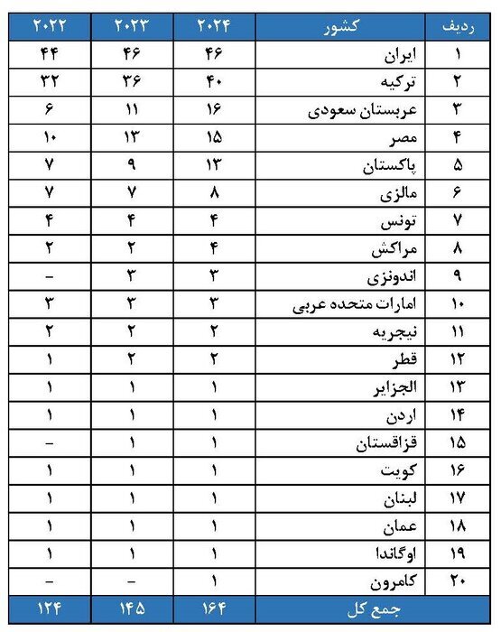 وی افزود: پس از ایران، ترکیه و عربستان سعودی به ترتیب با ۴۰ و ۱۶ دانشگاه در رتبه‌های دوم و سوم قرار دارند.