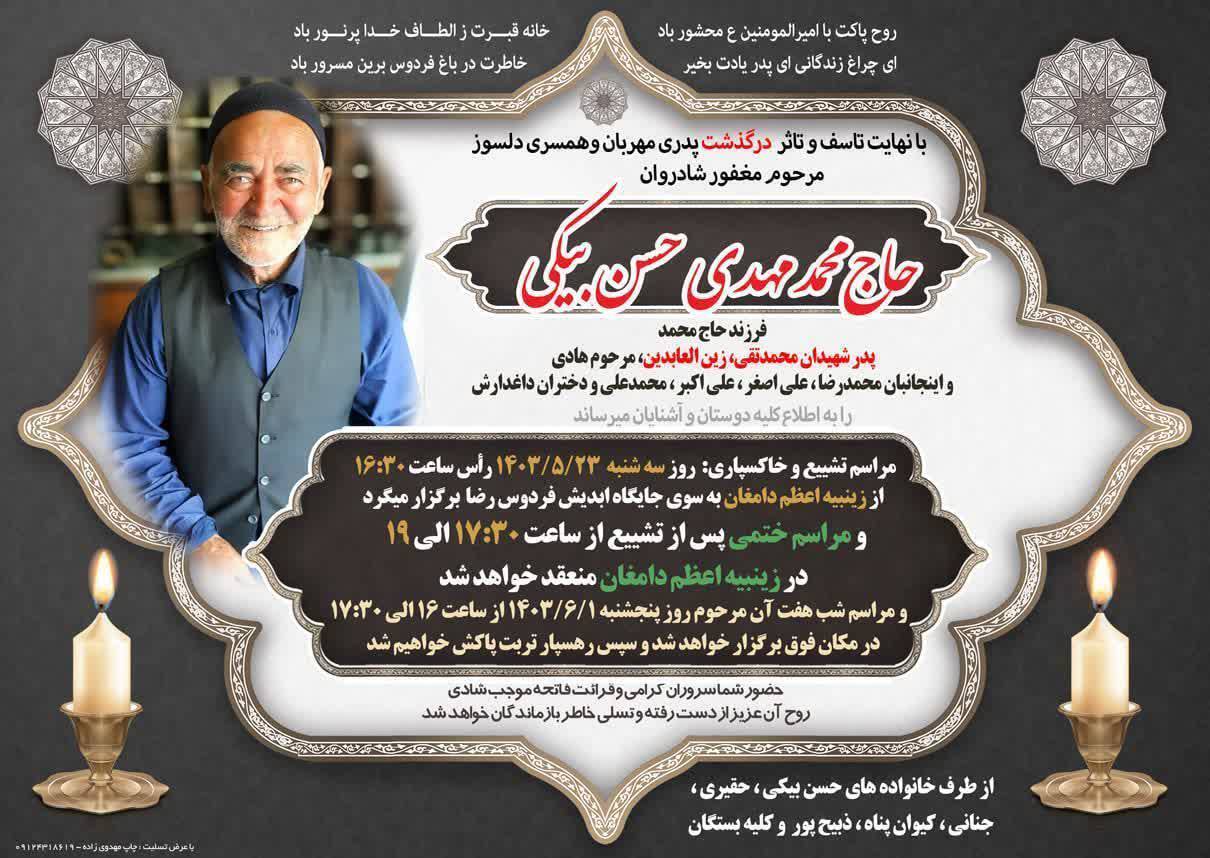 محمد مهدی حسن بیکی پدر شهیدان محمد تقی و زین العابدین حسن بیکی از شهدای دفاع مقدس در دامغان دار فانی را وداع گفت