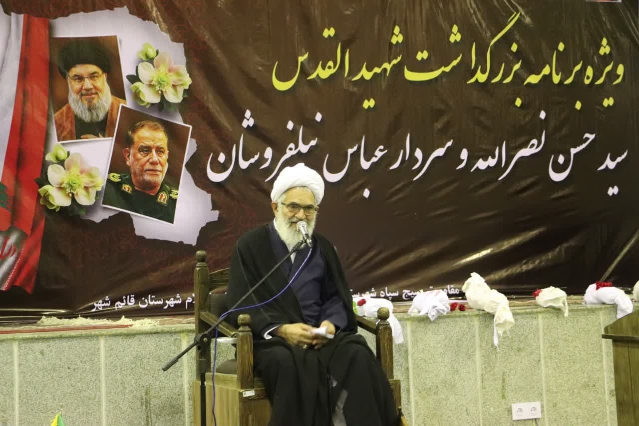 آیت الله معلمی عضو مجلس خبرگان رهبری و امام جمعه قائم شهر در این مراسم با اشاره به هجمه و گستره جنگ اسرائیل با حمایتهای همهجانبه آمریکا و دیگر قدرتهای استکباری گفت: در جنایات اسرائیل غاصب، آمریکا پیشرفتهترین تجهیزات نظامی را در اختیار این رژیم کودک کش میگذارد، همان گونه که در جنگ تحمیلی پشت صدام ایستاده بودند و پیشرفتهترین سلاح را در اختیار صدام میگذاشتند. وی تاکید کرد: امروز آمریکاییها و اروپاییها پشت سر صهیونیستهای جنایتکار ایستاده اند و جنگی که باید در عرصه نظامی باشد بر سر خانوادههای بی دفاع و زن و مرد و کودکان بمب میافکنند، خانهها را ویران میکنند و همه را زیر آوار به شهادت میرسانند، چون اینها جانیان بالفطره هستند.