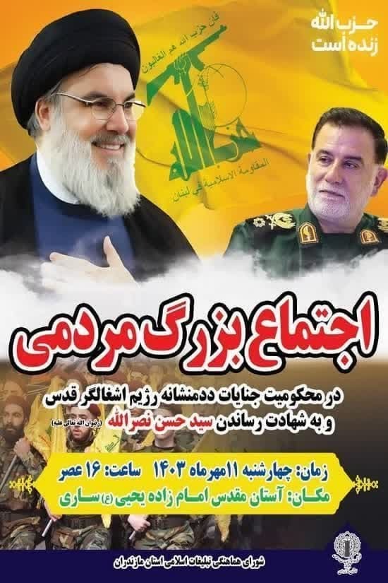 به گزارش خبرگزاری صدا و سیمای مازندران، شورای هماهنگی تبلیغات اسلامی استان مازندران اعلام کرد: اجتماع بزرگ مردمی در محکومیت جنایات رژیم نامشروع صهیونیستی در غزه و لبنان، از ساعت ۱۶ فردا چهارشنبه ۱۱ مهر در صحن امامزاده یحیی (ع) ساری برگزار می‌شود.