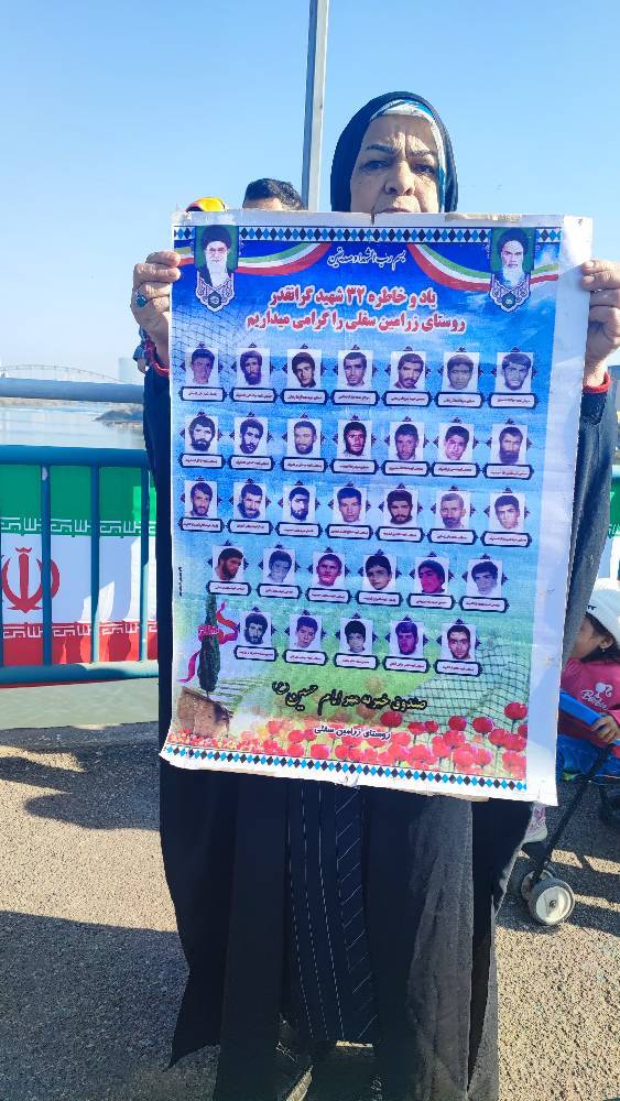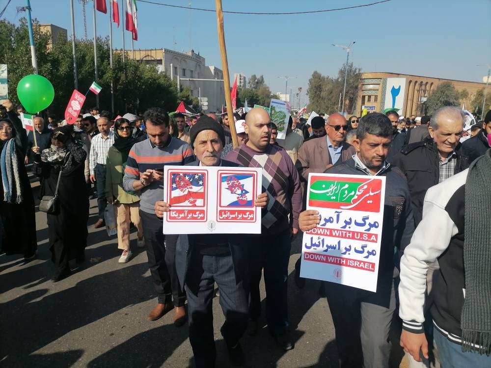رنگین کمان اقوام خوزستانی همه در کنار یکدیگر در حالی که پرچم ایران و تصاویری از امام خمینی (ره) و مقام معظم رهبری در دست دارند، فریاد «مرگ بر آمریکا» و «مرگ بر اسرائیل» سر میدهند.