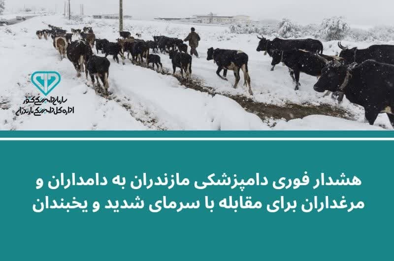 به گزارش خبرگزاری صدا و سیمای مازندران، در هشدار فوری دامپزشکی مازندران به دامداران و مرغداران برای مقابله با سرمای شدید و یخبندان آمده است: بر اساس اخطار هواشناسی استان مازندران به ویژه در مناطق مرتفع و کوهستانی از فردا شاهد افت دما و یخبندان گسترده خواهند بود. این شرایط می‌تواند موجب افزایش خطر ابتلای دام‌ها و طیور به بیماری‌های تنفسی، کاهش تولیدات لبنی و تخم مرغ، یخزدگی منابع آب و حتی تلفات گسترده شود.