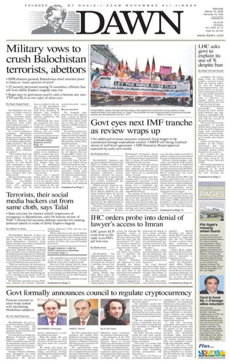 - حمله به قطار «جعفر اکسپرس»، ارتش پاکستان: مهاجمان از سلاحهای هندی و افغانی استفاده کردهاند.