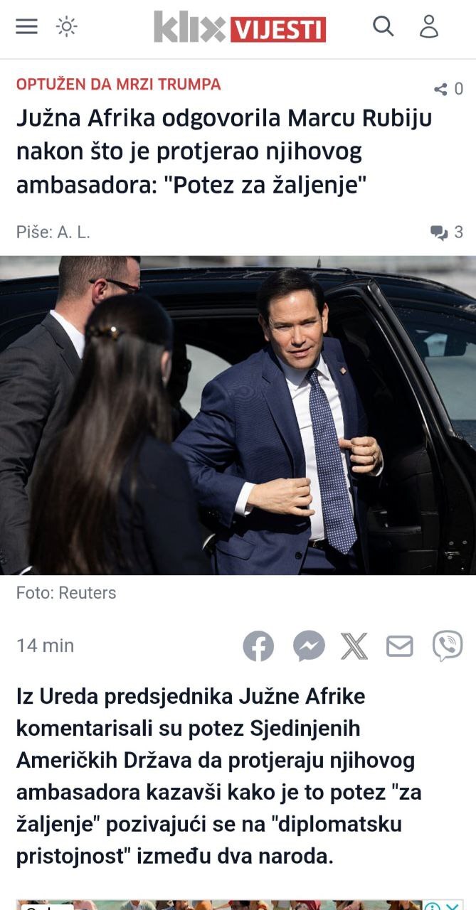 دفتر رئیس جمهور آفریقای جنوبی در واکنش به اقدام ایالات متحده برای اخراج سفیر این کشور، آن را اقدامی "تأسفآور" و با اشاره به "نجابت دیپلماتیک" بین دو کشور خواند.