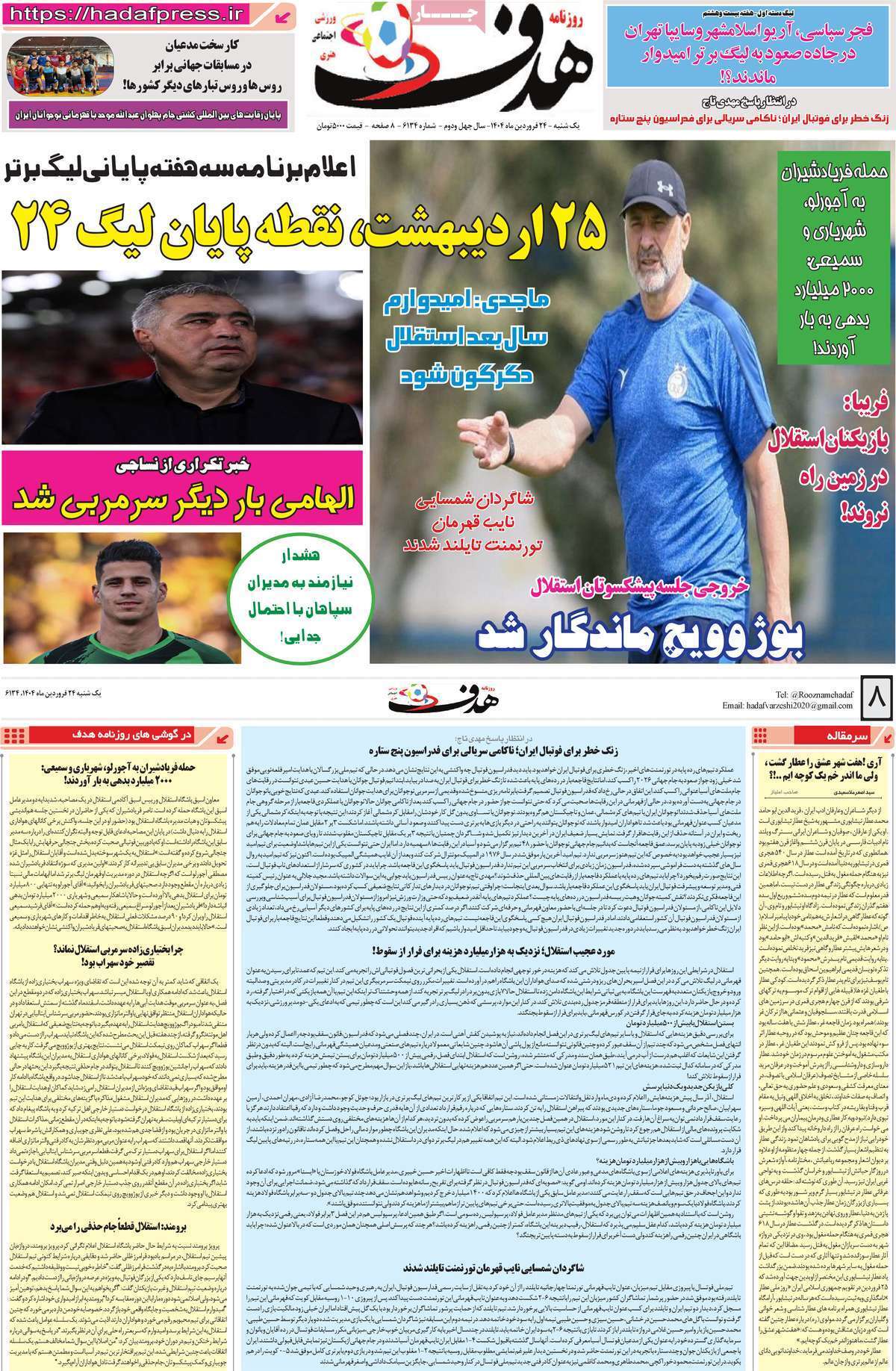 نیم صفحه نخست روزنامه‌های ورزشی ۲۴ فروردین