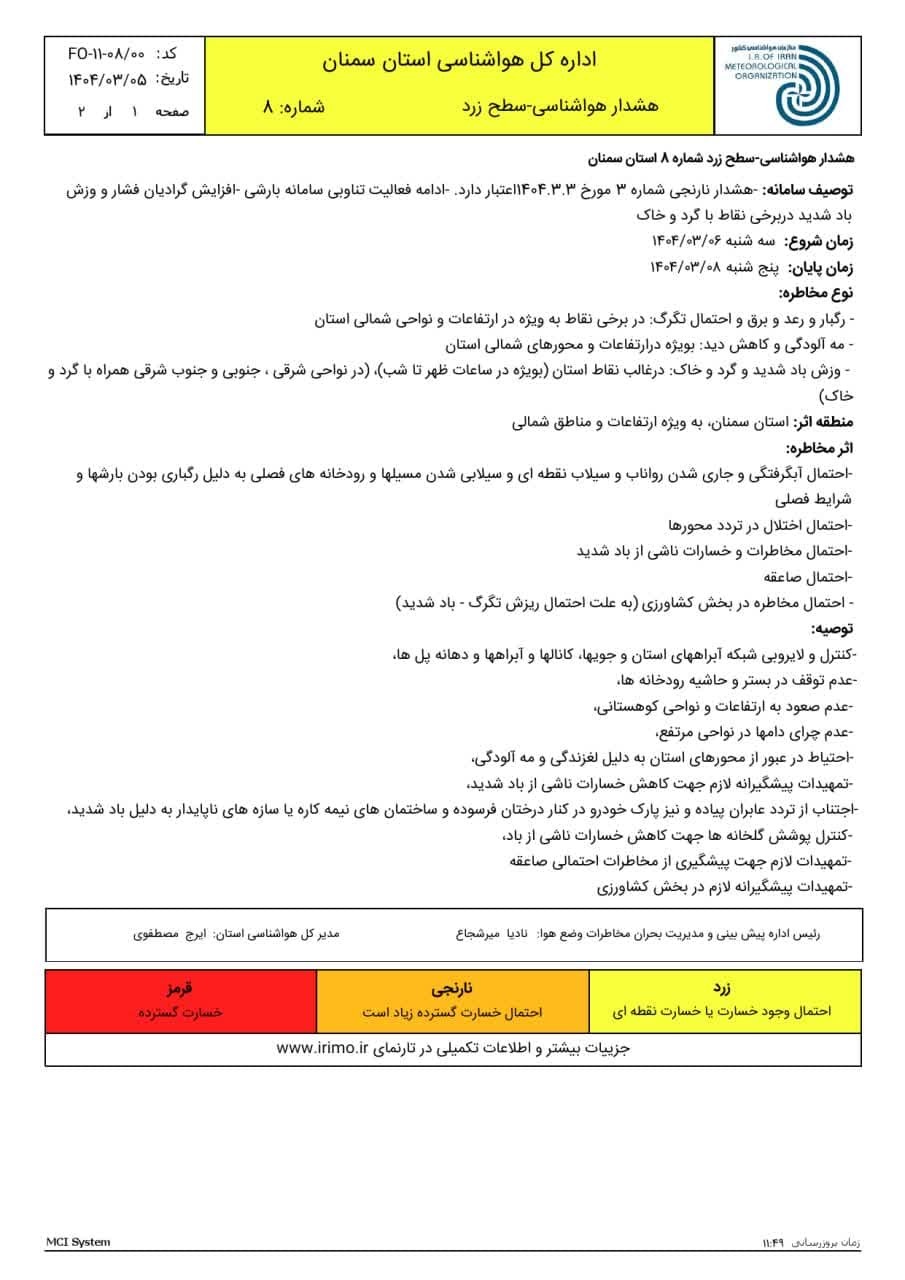 اعلام هشدار زرد باد و باران در سمنانبه گزارش خبرگزاری صداوسیما؛ مرکز سمنان،️  ️ مدیرکل هواشناسی استان سمنان با اشاره به پیش‌بینی وزش باد شدید، رگبار و رعد و برق در برخی نقاط این استان، افزود: از امروز تا پنجشنبه در غالب نقاط با شدت بیشتر در ارتفاعات و نواحی شمالی رگبار و رعد و برق، وزش بادشدید گاهی گردوخاک (از ظهر تا شب)، در برخی نقاط تگرگ پیش بینی شده است.