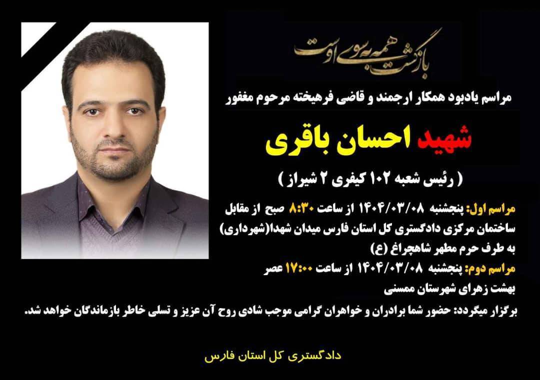 مراسم تشییع پیکر قاضی شهید احسان باقری، رئیس شعبه ۱۰۲ کیفری ۲ شیراز، فردا پنج‌شنبه ۸ خرداد از مقابل دادگستری فارس به‌سوی حرم مطهر حضرت شاهچراغ (ع) برگزار خواهد شد.
