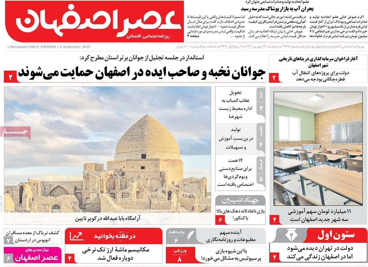 صفحه نخست روزنامه‌های اصفهان (پنج شنبه ۱۳ شهریور ۱۴۰۴)