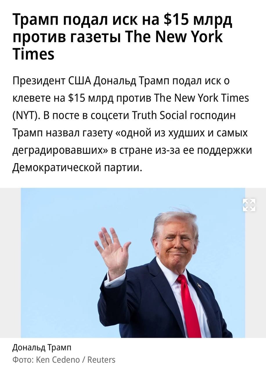- ترامپ از نیویورک تایمز شکایت ۱۵ میلیارد دلاری کرد؛ این روزنامه را سخنگوی «چپ رادیکال» خواند. دونالد ترامپ یک دادخواست افترا ۱۵ میلیارد دلاری علیه نیویورک تایمز تنظیم کرده و این روزنامه را به عنوان سخنگوی دموکراتها که در یک کمپین طولانی مدت بدنامسازی درگیر است، متهم کرده است.