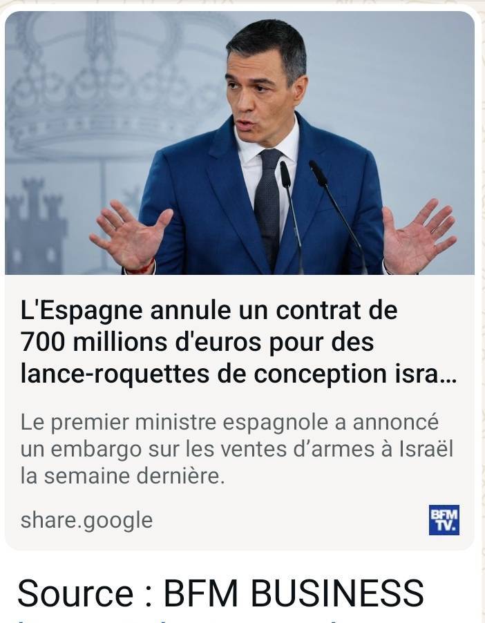 - اسپانیا قرارداد ۷۰۰ میلیون یورویی خرید راکت انداز از رژیم اسراییل را لغو کرد نخست وزیر اسپانیا اعلام کرد از هفته گذشته تحریمهای فروش تسلیحات نظامی به رژیم اسراییل را هم اجرا کرده است.