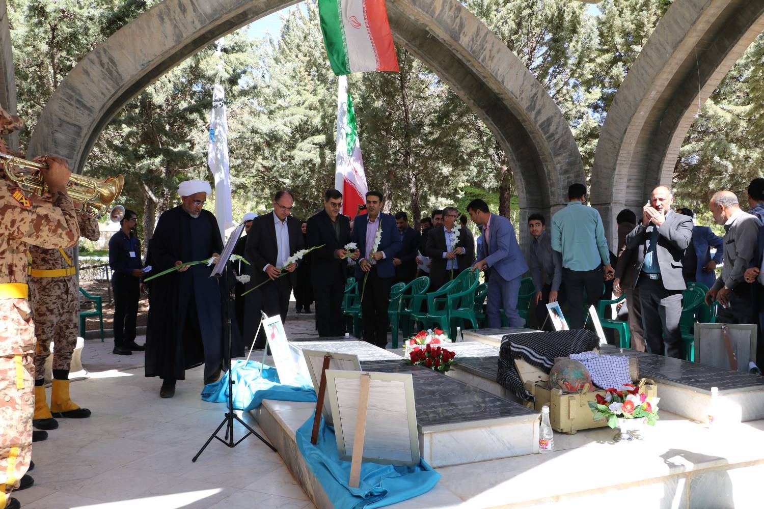 شرکت کنندگان با نثار شاخههای گل بر سر قبور مطهر پنج شهید گمنام دانشگاه آزاد اسلامی که در چهارم آبان ماه سال ۱۳۸۷ در جوار مسجد النبی (ص) دانشگاه آرام گرفتند؛ یاد و خاطرات رشادتهای رزمندگان دفاع مقدس را گرامی داشتند.