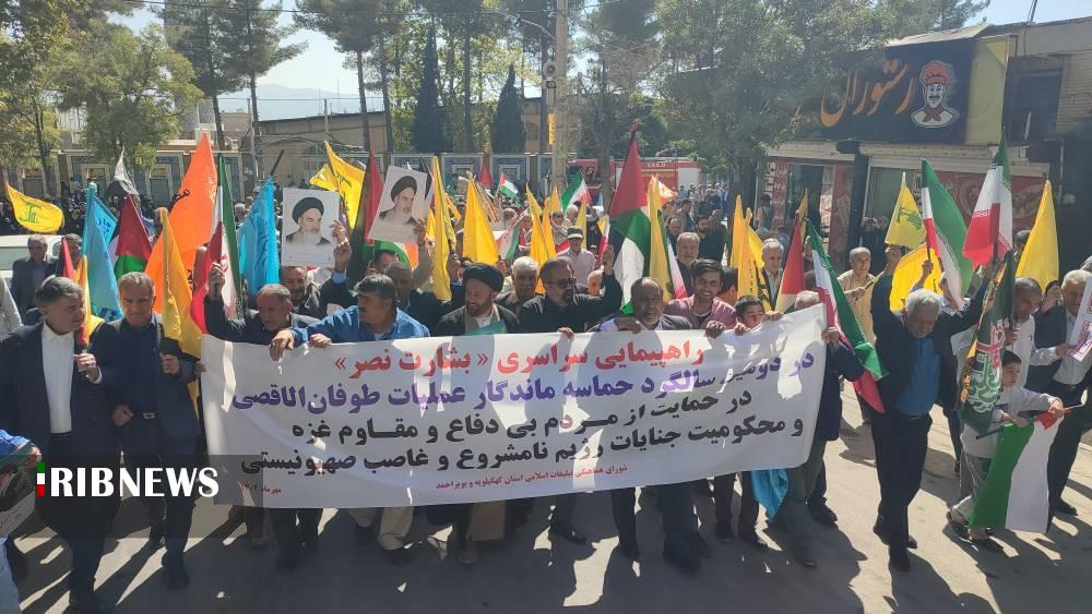 به گزارش خبرگزاری صدا و سیمای کهگیلویه و بویراحمد، عموم مردم مؤمن، بصیر و همیشه در صحنه استان بپاس گرامیداشت پایداری ملت قهرمان غزه، بعد از اقامه نماز عبادی و سیاسی جمعه با شرکت در راهپیمایی سراسری بشارت نصر حمایت خود را از این ملت مقاوم نشان دادند.