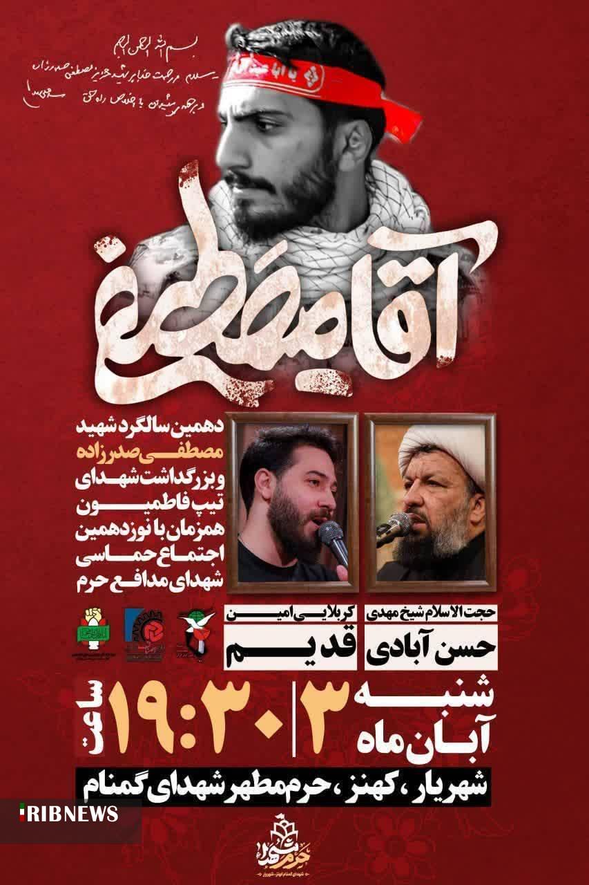 به گزارش خبرنگار خبرگزاری صداوسیما ؛ به مناسبت دهمین سالگرد شهید مدافع حرم سید مصطفی صدرزاده ؛ مراسم بزرگداشت شهدای لشکر فاطمیون در شهریار برگزار میشود. این مراسم شنبه ۳ آبان از ساعت ۱۹:۳۰ در حرم شهدایگمنام کهنز واقع در شهریار برگزار خواهد شد. سید مصطفی صدرزاده، معروف به سید ابراهیم، فرمانده ایرانی گردان عمار لشکر فاطمیون، یکم آبان سال ۹۴ همزمان با تاسوعای حسینی در مبارزه با تروریستهای تکفیری در حومه حلب شهید و پیکرش در گلزار شهدای بهشت رضوان شهریار خاکسپاری شد.