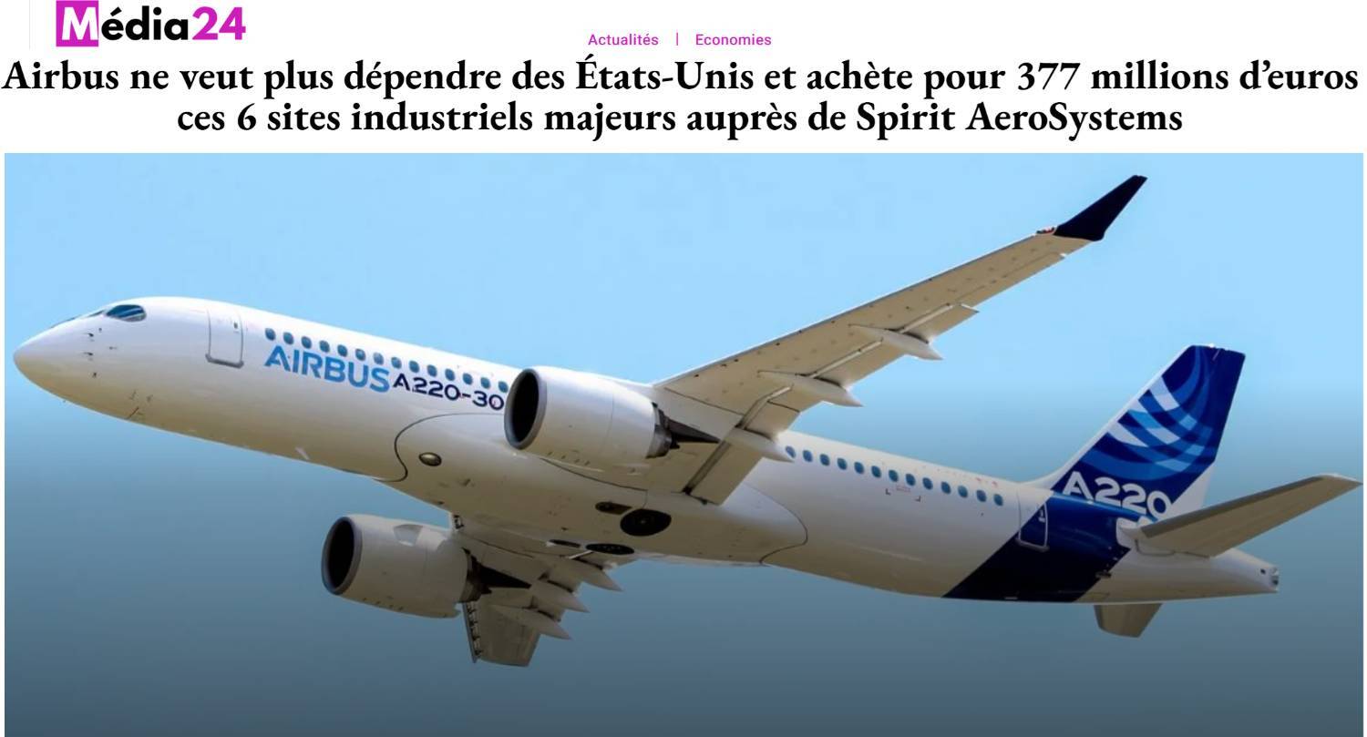 – شرکت هواپیماسازی ایرباس نمیخواهد همچنان به آمریکا وابسته باشد. این شرکت خرید ۶ مرکز صنعتی اساسی وابسته به اسپیریت آیرو سیستم را نهایی کرد.