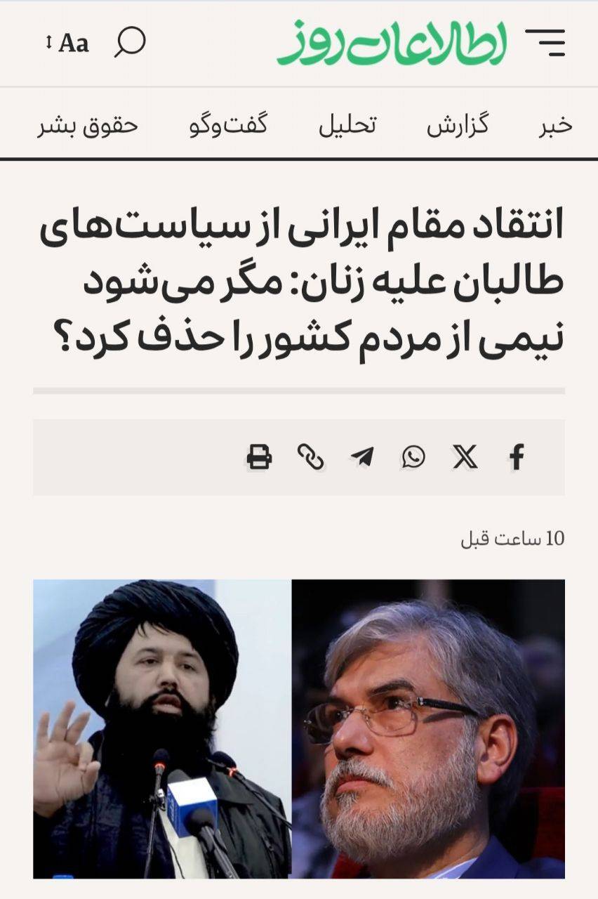 - انتقاد مقام ایرانی از سیاست‌های طالبان: مگر می‌شود نیمی از مردم این کشور را حذف کرد