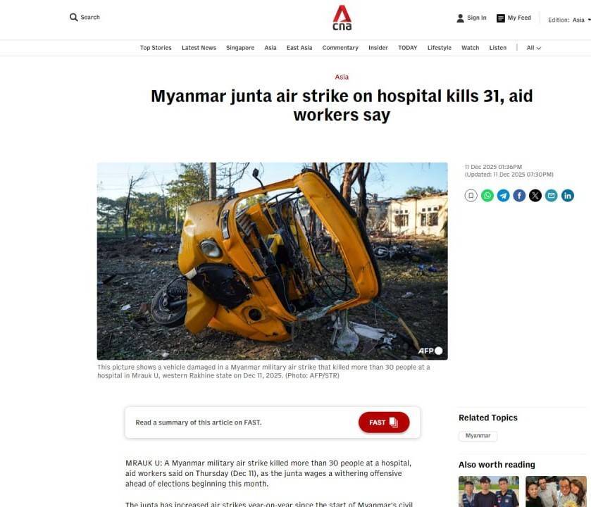 - نیرو‌های امدادی: بر اثر حمله هوایی ارتش میانمار به یک بیمارستان، ۳۱ نفر جان خود را از دست دادند