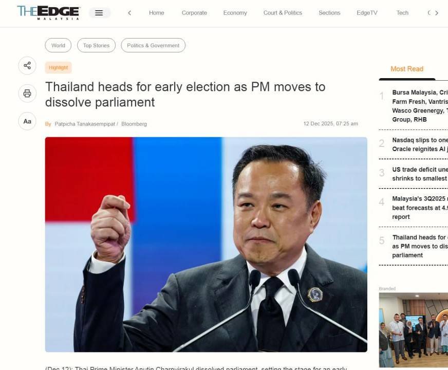 - حرکت تایلند به‌سمت انتخابات زودهنگام پس از اقدام نخست‌وزیر برای انحلال پارلمان