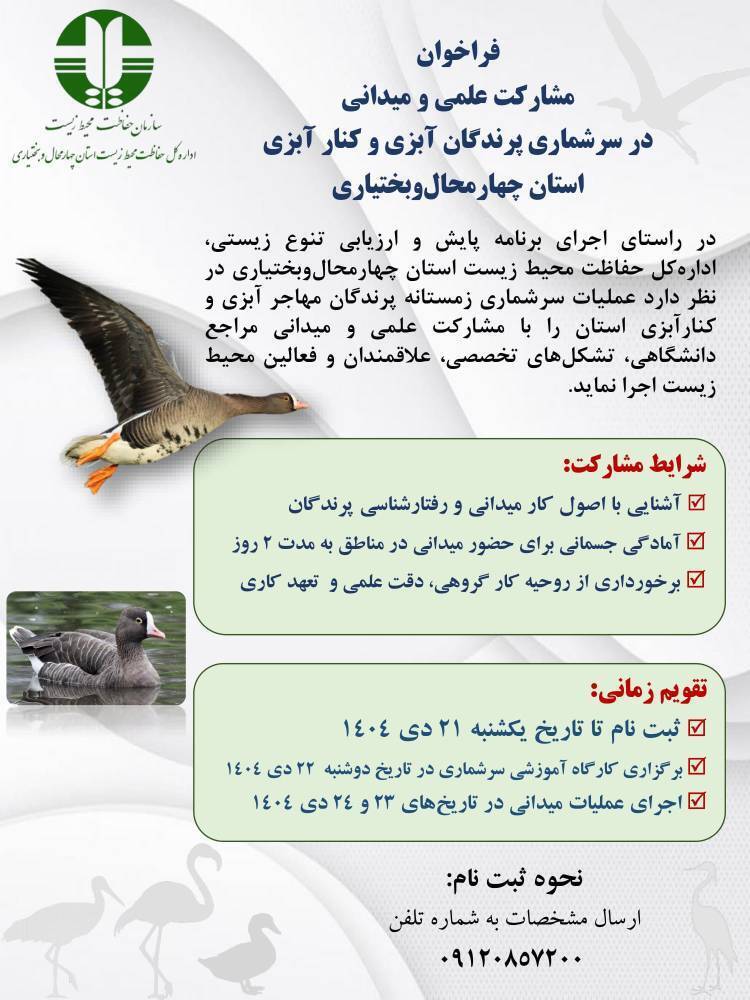 به گزارش خبرگزاری صدا و سیما مرکز چهارمحال و بختیاری، مدیر کل حفاظت محیط زیست استان از کارشناسان، پژوهشگران، دانشجویان و علاقه‌مندان محیط‌زیست در کشور برای مشارکت در سرشماری زمستانه پرندگان آبزی و کنارآبزی دعوت کرد به اداره کل محیط زیست چهارمحال و بختیاری مراجعه کنند.