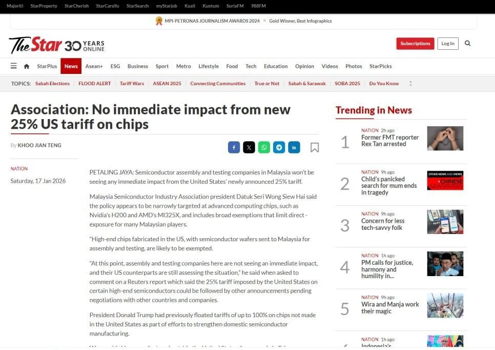 - انجمن نیمه هادی‌های مالزی: تعرفه جدید ۲۵ درصدی آمریکا بر تراشه‌ها تأثیر فوری نداشت