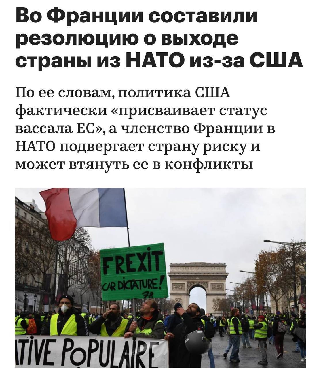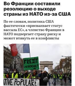 ⁃ در فرانسه پیش‌نویس قطعنامه‌ای برای خروج این کشور از ناتو به دلیل سیاست‌های آمریکا تهیه شده است