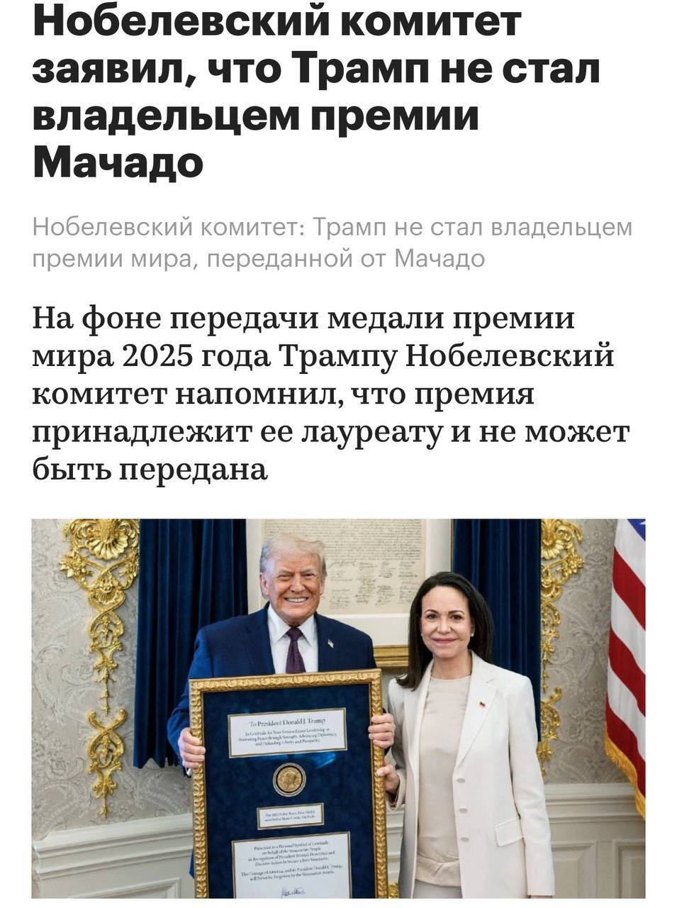 ⁃ کمیته نوبل اعلام کرد که ترامپ برنده جایزه «ماچادو» نشده است
