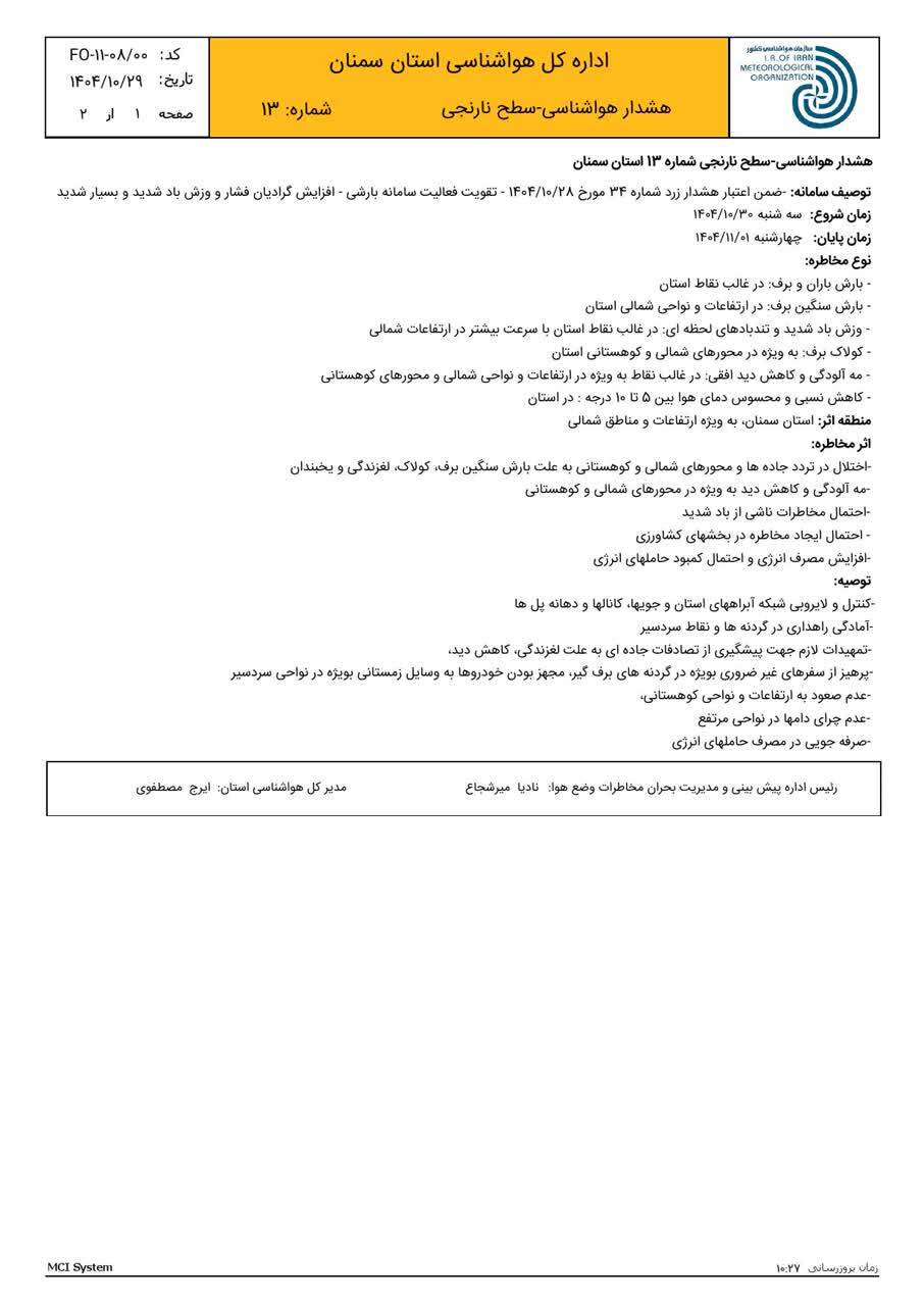 مدیرکل هواشناسی استان سمنان درباره خسارتهای ناشی از بارش برف و باران، کولاک و کاهش محسوس دمای هوا به مدت دو روز هشدار نارنجی اعلام کرد.