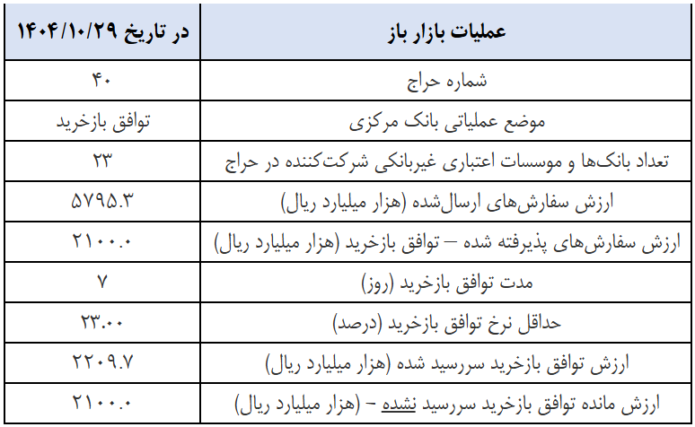 گزارش عملیات اجرایی سیاست پولی (۲۹ دی ماه ۱۴۰۴) به شرح زیر است: