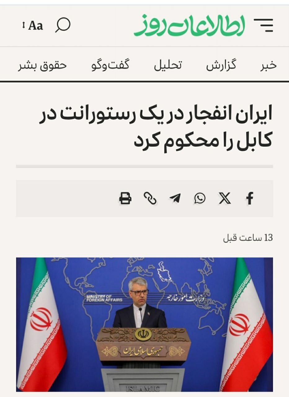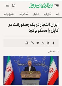 - ایران، انفجار در یک رستوران در شهر کابل را محکوم کرد