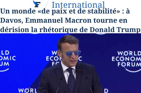- مکرون و تمسخر غیرمستقیم دونالد ترامپ، رئیس جمهور فرانسه در مجمع جهانی اقتصاد داووس با لحنی طعنه آمیز و کنایه دار به انتقاد از گفتمان و ادعاهای ترامپ پرداخت