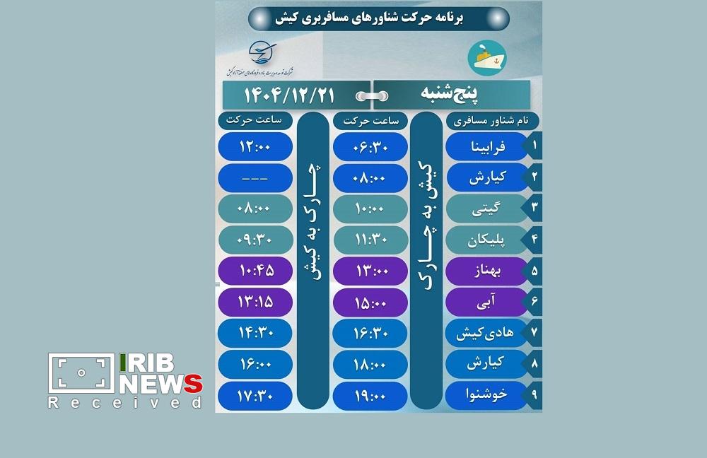 روابط عمومی شرکت توسعه و مدیریت بنادر و فرودگاههای کیش، برنامه حرکت شناورهای مسافربری فردا پنج شنبه ۲۱ اسفند را اعلام کرد.
