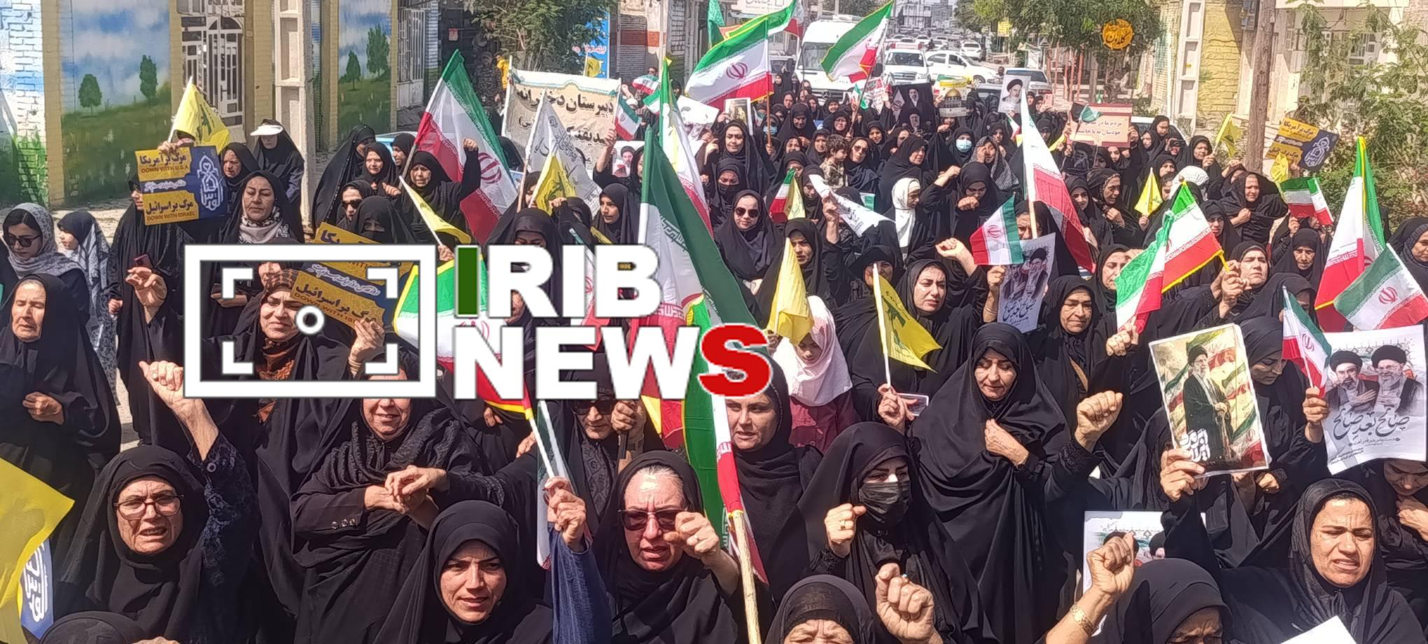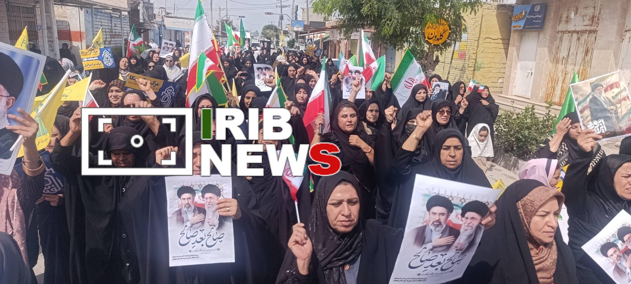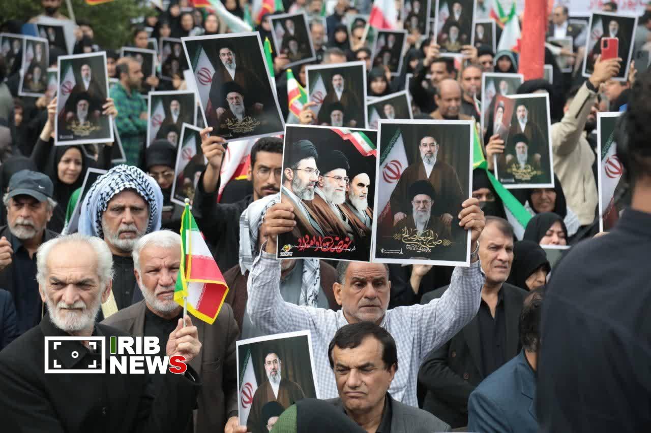 مردم با در دست داشتن پرچم ایران، تصاویری از رهبر شهید حضرت آیت الله سیدعلی حسینی خامنه‌ای و سردادن شعار‌هایی ازجمله؛ دست خدا عبیان شد، خامنه‌ای جوان شد، نه سازش نه تسلیم نبرد با آمریکا، مرگ بر آمریکا و مرگ بر اسرائیل، ضمن محکوم کردن تحمیل جنگ بر کشورمان، خواستار انتقام‌جویی شهادت رهبری، فرماندهان و دیگر هموطنان هستند.