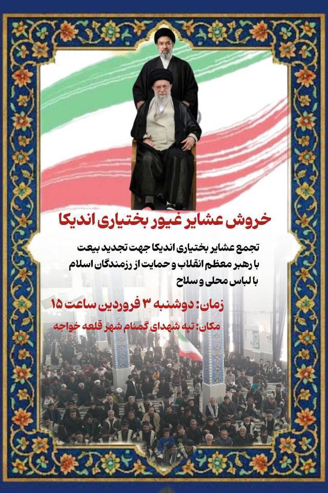 به گزارش خبرگزاری صدا و سیمای استان خوزستان، تجمع مردمی عشایر غیور بختیاری شهرستان اندیکا ساعت ۱۵ روز دوشنبه سوم فروردین ماه ۱۴۰۵ برگزار خواهد شد.