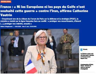 کاترین وُترن بار دیگر تأکید کرد: فرانسه همچنان در پی یافتن راه حلی دیپلماتیک برای بحران است و افزود: موضع پاریس غیرتصاعدی و صرفا دفاعی است. در این چارچوب، پاریس میکوشد از هرگونه درگیری مستقیم در جنگی که آغازگر آن نبوده است پرهیز کند، در عین حال که به تعهدات امنیتی خود پایبند میماند.