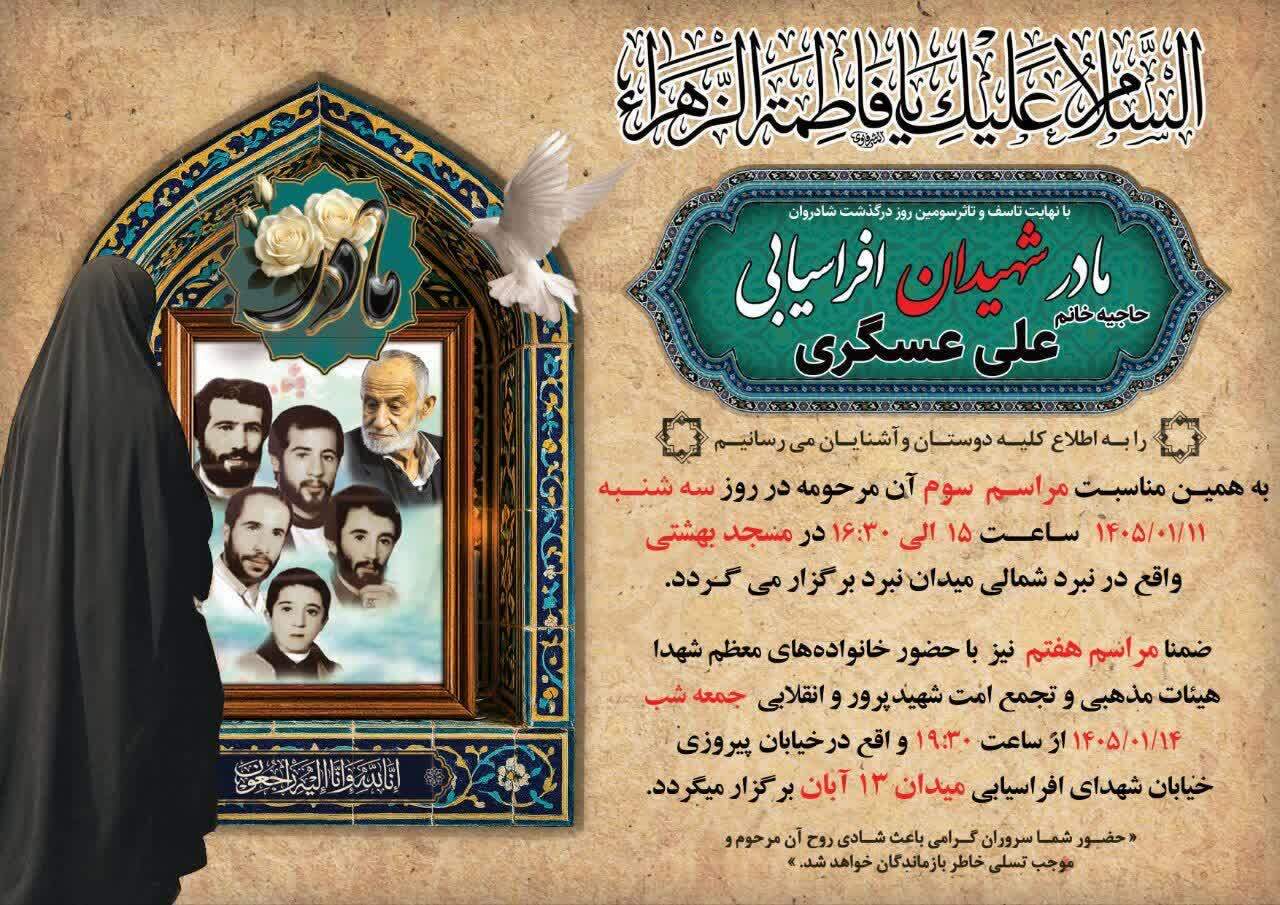 مراسم بزرگداشت مادر شهیدان افراسیابی امروز ساعت ۱۵ در مسجد بهشتی تهران برگزار می‌شود.