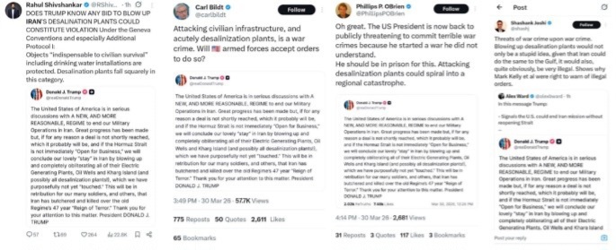 منفجر کردن کارخانههای آب شیرینکن نه تنها ایدهای احمقانه است، با توجه به اینکه ایران میتواند همین کار را با خلیج فارس انجام دهد، بلکه کاملاً بدیهی است که بسیار غیرقانونی نیز خواهد بود. نشان میدهد که چرا مارک کلی و همکارانش حق داشتند در مورد دستورات غیرقانونی هشدار دهند.»