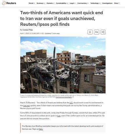 به گزارش خبرگزاری صدا و سیما، بر اساس نظرسنجی «رویترز» و مؤسسه «ایپسوس»، حدود ۶۶ درصد آمریکایی‌ها معتقدند این کشور باید برای پایان دادن سریع به مداخله خود در جنگ ایران تلاش کند، حتی اگر این به معنای دست نیافتن به هدف‌هایی باشد که ترامپ تعیین کرده است.