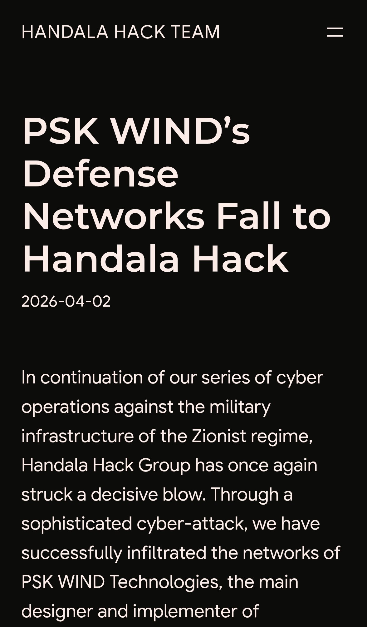 به گزارش سرویس بین الملل خبرگزاری صدا و سیما؛ گروه هکری حنظله: در یک حمله سایبری پیشرفته، ما با موفقیت به شبکههای شرکت PSK WIND Technologies، طراح و مجری اصلی سامانههای یکپارچه فرماندهی و کنترل پدافند هوایی این رژیم، نفوذ کرده و تمامی دادههای حساس موجود در سرورهای آن را بهطور کامل استخراج کردهایم.