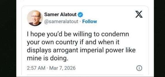 سامر العطوط؛ جامعهشناس و مدرس دانشگاه ویسکانسین آمریکا و نویسنده کتاب «قرن فلسطینی» ضمن محکومیت حمله به ایران، حملات تلافی جویانه علیه نیروهایی آمریکایی در منطقه را کاملا منطقی دانست.