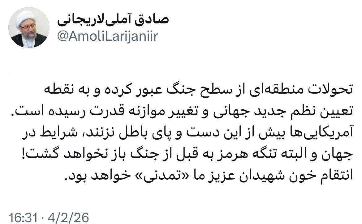 آیت الله آملی لاریجانی با اشاره به تعیین نظم جدید جهانی نوشت: شرایط در جهان و البته تنگه هرمز به قبل از جنگ باز نخواهد گشت.