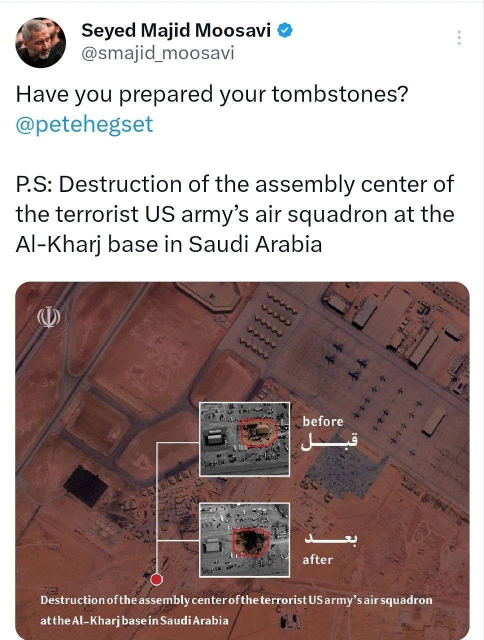 به گزارش خبرگزاری صداوسیما، سردار سیدمجید موسوی فرمانده نیروی هوافضای سپاه خطاب به وزیر جنگ آمریکا نوشت: هگست سنگ قبرهایتان را آماده کرده‌اید؟