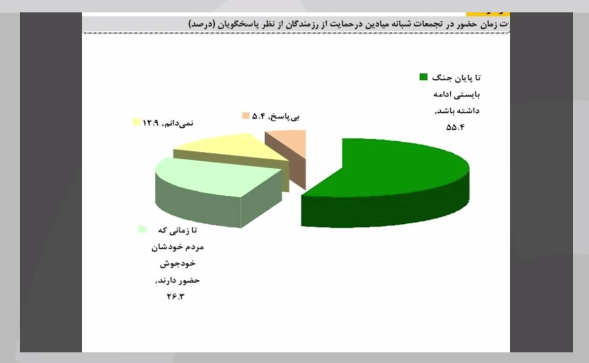 همچنین ۸۱.۷ درصد از پاسخگویان اعلام کردهاند این تجمعات و کاروانها تا پایان جنگ یا تا زمانی که مردم خودجوش حضور دارند، باید ادامه یابد.