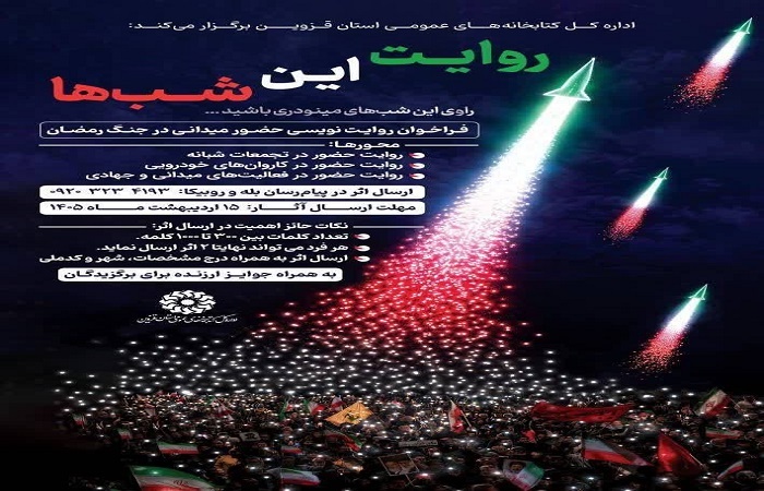اداره کل کتابخانههای عمومی استان قزوین اعلام کرد: شرکت کنندگان در روایتنویسی حضور میدانی در جنگ تحمیلی سوم تا ۱۵ اردیبهشت فرصت دارند آثار خود را ارسال کنند.