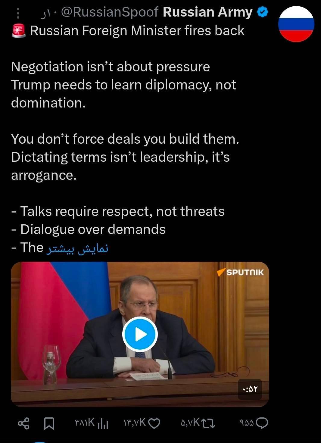 وزیر خارجه روسیه در واکنش پیرامون تحولات جنگ آمریکا و رژیم صهیونی با کشورمان گفت: مذاکره بر اساس فشار نیست ترامپ باید به جای سلطهجویی، دیپلماسی یاد بگیرد.