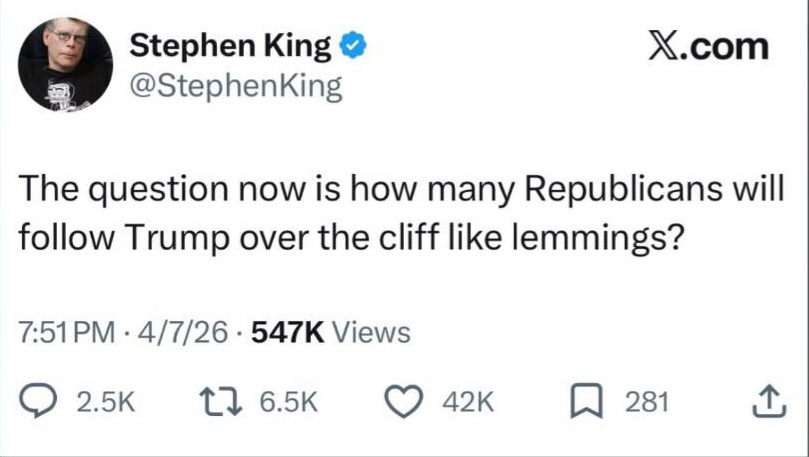 استفن کینگ، نویسنده پرفروش ژانر وحشت، در تازهترین پیام خود در شبکه اجتماعی «ایکس»، به سیاستهای «دونالد ترامپ» واکنش نشان داد و حامیان او را به چالش کشید.