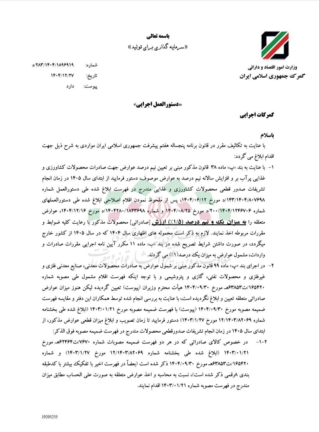 در متن بخشنامه تأکید شده، واحدها و گمرکات اجرایی کشور موظف به ابلاغ، اجرا و نظارت مستمر بر حسن اجرای این مصوبه هستند.