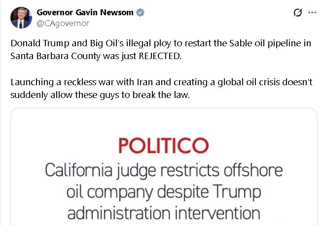 گاوین نیوسام در پیامی در فضای مجازی نوشت: طرح غیرقانونی دونالد ترامپ و شرکتهای بزرگ نفتی برای راهاندازی مجدد خط لوله نفت سِبل در شهرستان سانتا باربارا رد شد.