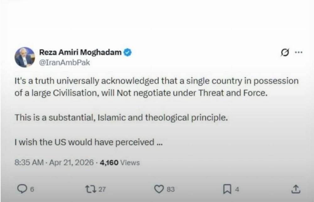 به گزارش سرویس بین الملل خبرگزاری صدا و سیما از اسلام آباد، سفیر ایران در پاکستان با اشاره به تحولات مرتبط با گفتوگوهای احتمالی میان ایران و آمریکا در اسلامآباد، اظهار داشت: «این یک حقیقت شناخته شده است که کشوری با تمدن بزرگ، هرگز تحت تهدید و فشار مذاکره نمیکند».