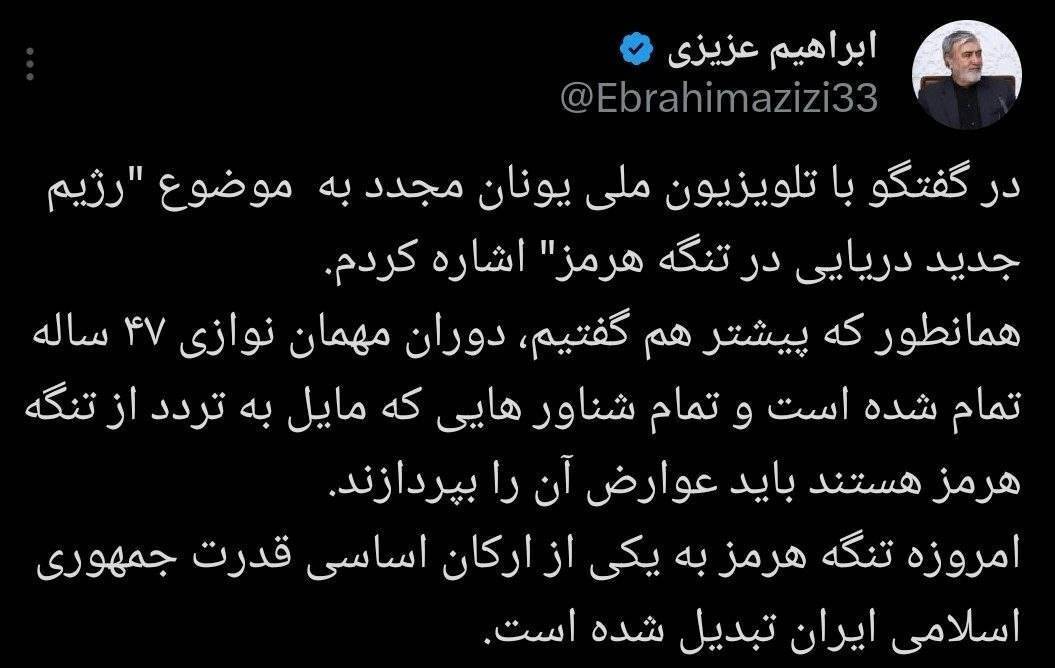 به گزارش خبرگزاری صدا و سیما ابراهیم عزیزی در صفحه شخصی خود در فضای مجازی نوشت: تمام شناورهای عبوری از تنگه هرمز باید عوارض پرداخت کنند.