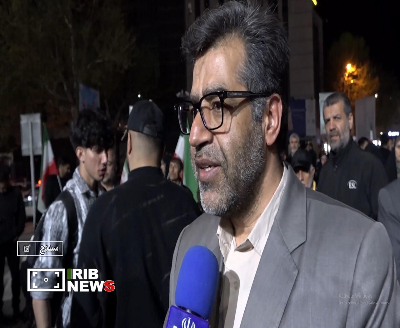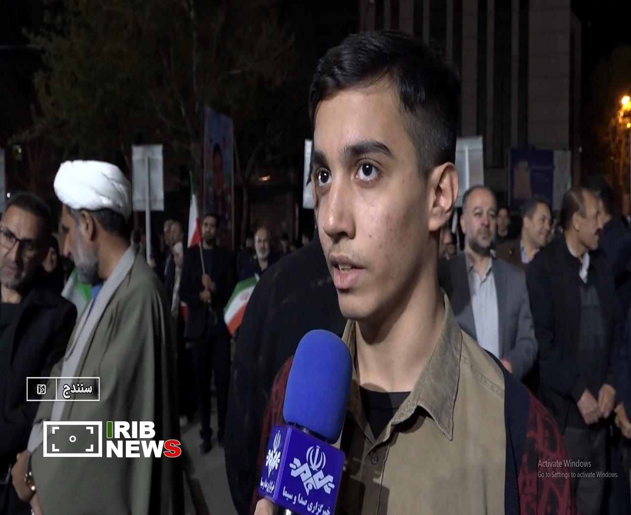 به گزارش خبرگزاری صدا و سیمای مرکز کردستان، مردم با رژه خودرویی و اهتزاز پرچم مقدس ایران اسلامی می‌گویند همیشه برای دفاع از وطن در سنگر هستند. برخی ها، با وجود سن کم، از هیچ تلاشی برای رونق بیشتر تجمعات شبانه دریغ نمی‌کنند.