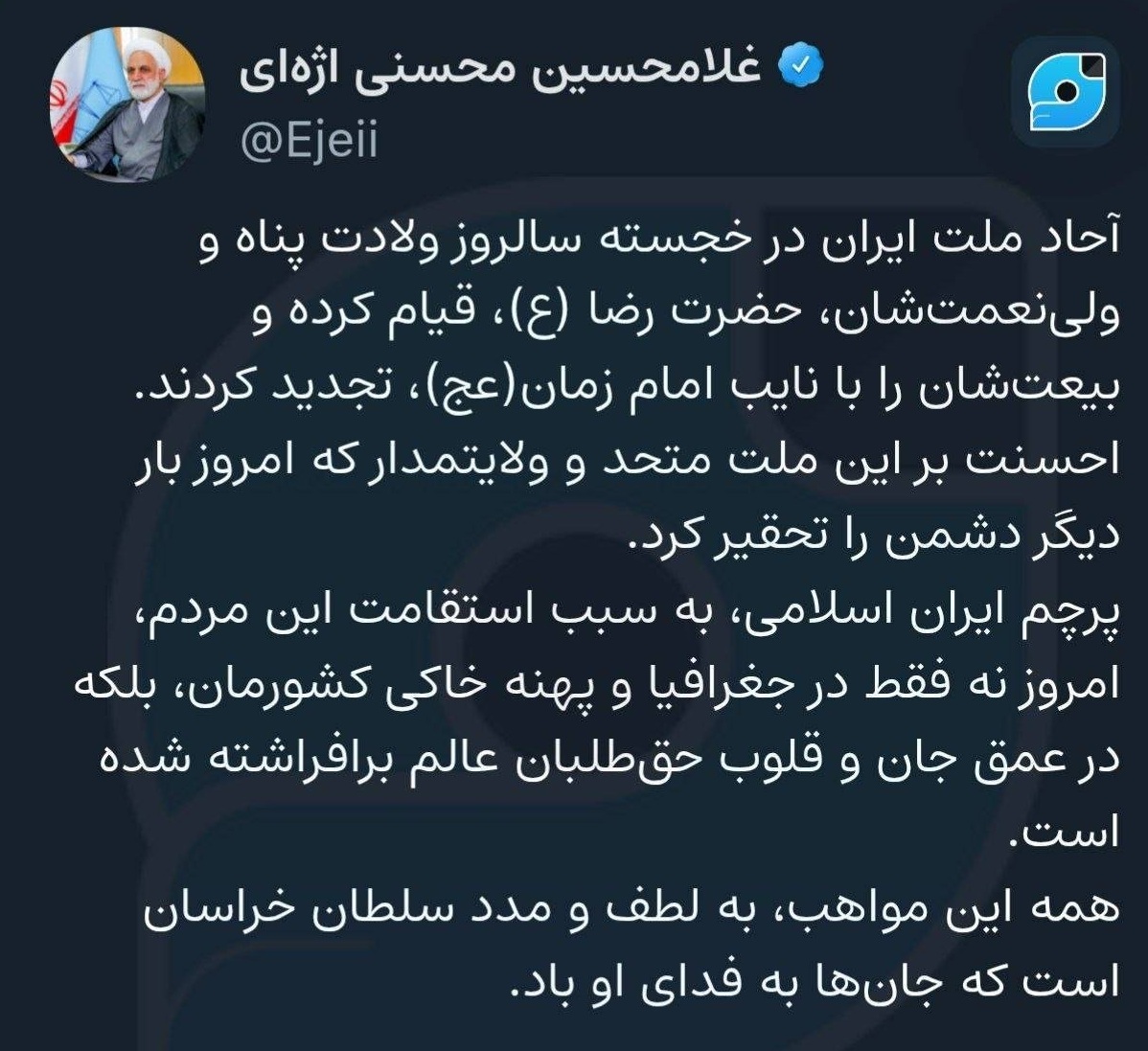 به گزارش خبرگزاری صدا و سیما، حجتالاسلام والمسلمین غلامحسین محسنی اژهای در ادامه این پیام آورده است: احسنت بر این ملت متحد و ولایتمدار که امروز بار دیگر دشمن را تحقیر کرد. پرچم ایران اسلامی به سبب استقامت این مردم، امروز نه فقط در جغرافیا و پهنه خاکی کشورمان، بلکه در عمق جان و قلوب حقطلبان عالم برافراشته شده است. همه این مواهب به لطف و مدد سلطان خراسان است که جانها به فدای او باد.